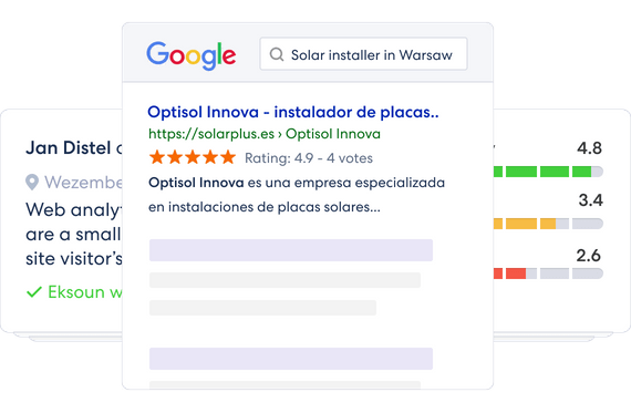 Contacta con tus clientes satisfechos y pide información sobre tu perfil. Estas reseñas serán visibles no sólo en nuestro sitio web, sino también en los resultados de búsqueda de Google.